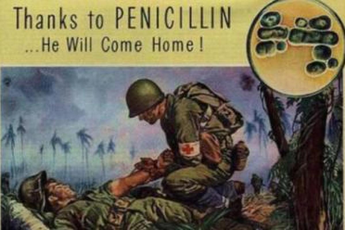Antibiotics were a revolutionary discovery in the 1920s and by the 1940s, when they had been developed for civilian use, they were the saviour of many, as the message in the poster here makes clear.